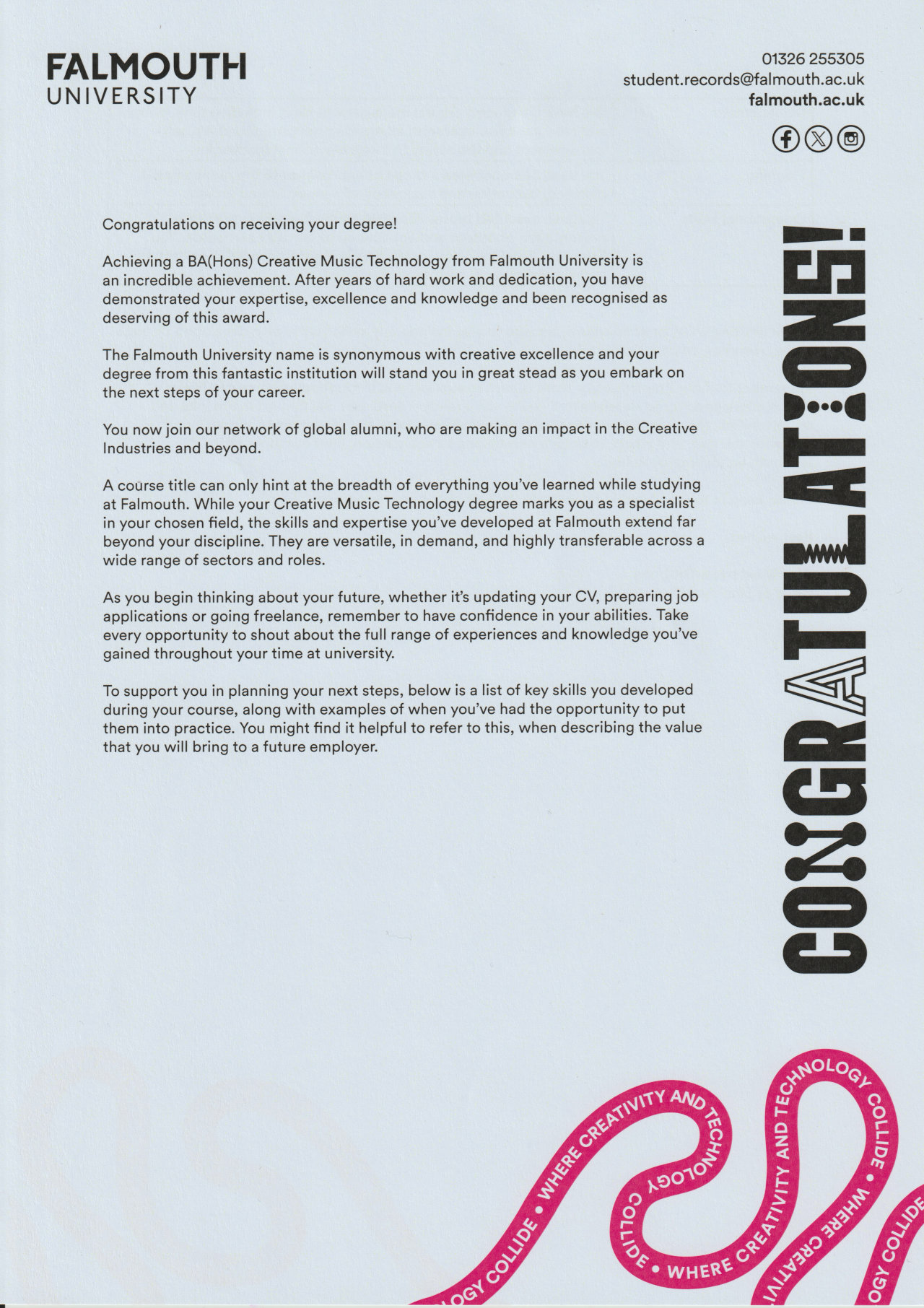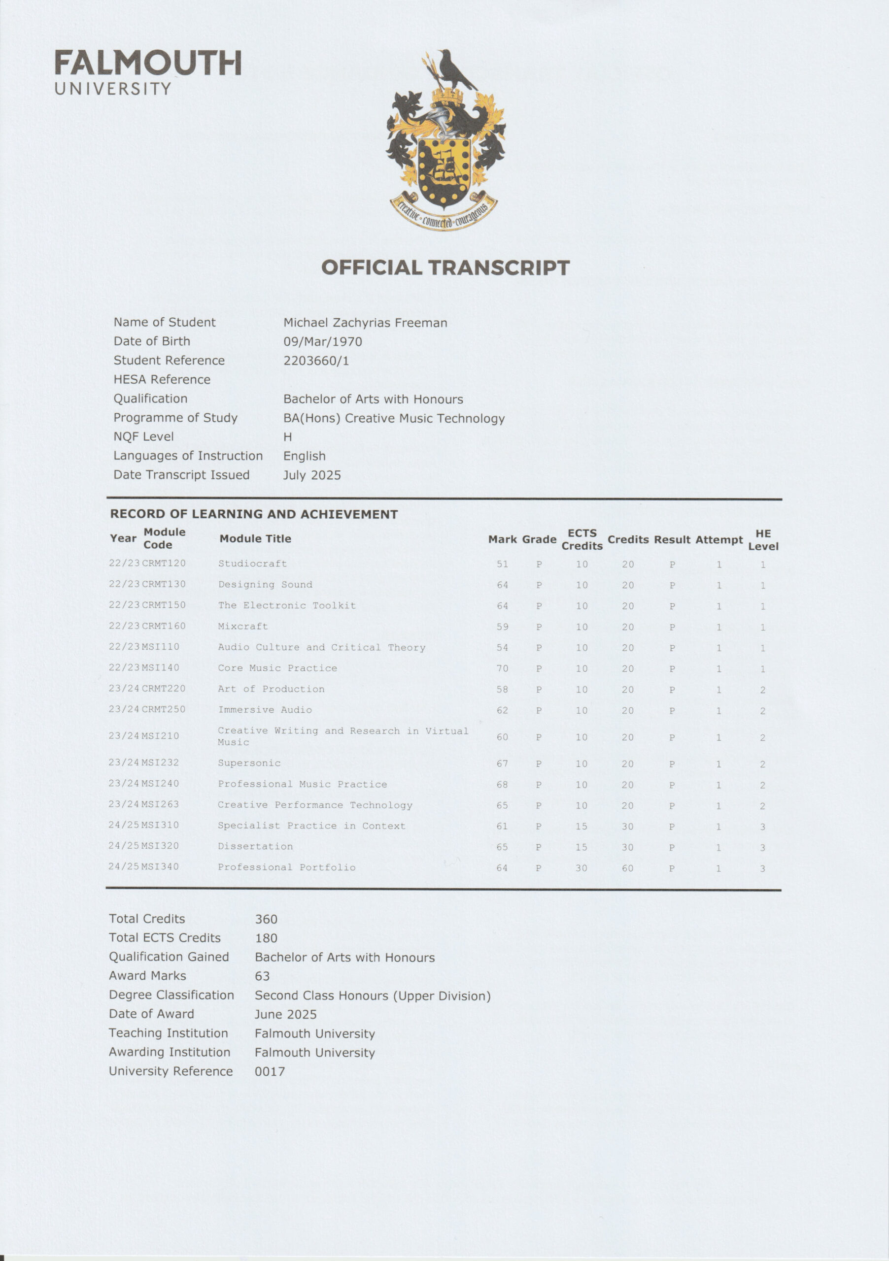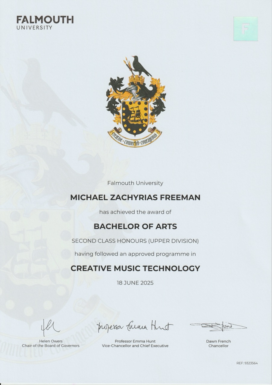 In 2022 I was accepted on the BA(Hons) Creative Music Technology at Falmouth University. I graduated in 2025 with a 2:1.